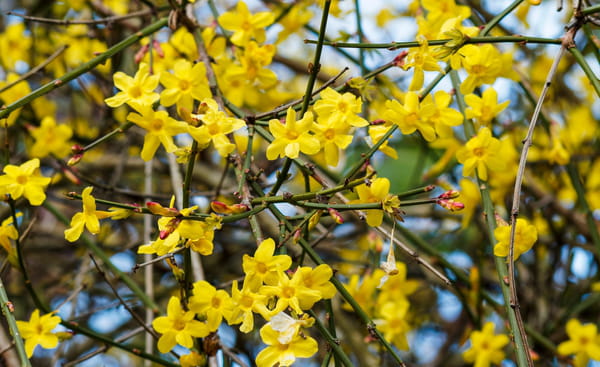 Cet arbuste grimpant se reconnaît à ses tiges souples qui s'étirent et retombent facilement, ainsi qu'à ses petites fleurs jaunes qui s'ouvrent avant même que les feuilles ne se développent. Ses pétales simples, mais vifs, créent de petites touches de couleur qui attirent immédiatement l'œil dans un jardin nu. Il supporte très bien le froid, ne craint pas les gelées et montre une étonnante capacité à fleurir en plein cœur de l'hiver. Sa croissance est rapide, sa silhouette légère, et il peut tout aussi bien courir sur un treillage que retomber en cascade sur un muret. Cette plante lumineuse n'est autre que le jasmin d'hiver.