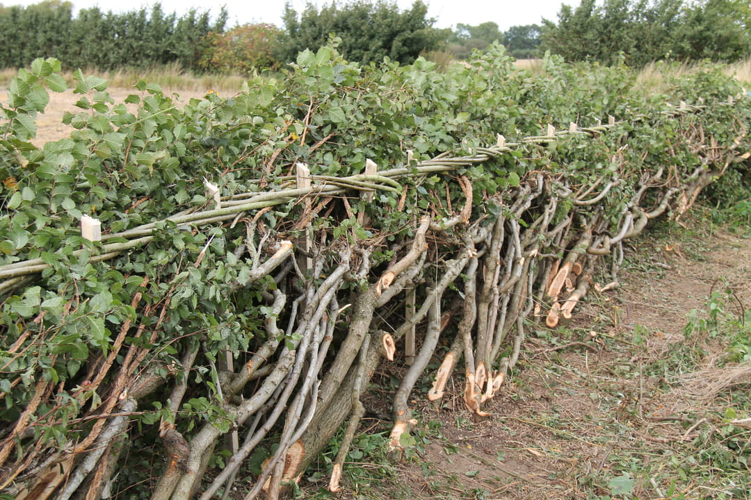 Cette solution miracle, c'est le plessage. Une technique qui consiste à fendre partiellement la base des troncs (les pléions) pour les incliner et les entrelacer horizontalement autour de piquets verticaux, sans jamais rompre la circulation de la sève. L'arbuste continue de pousser à l'horizontale, créant un réseau vivant et soudé.