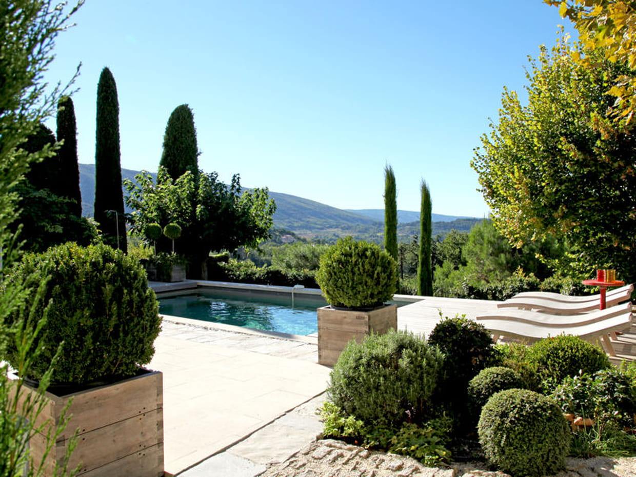 Cyprès et buis mènent la danse dans ce jardin du Lubéron. Au bord de la piscine, les deux espèces, taillées avec minutie, offrent à cet extérieur un raffinement bourgeois. Voir le reportage