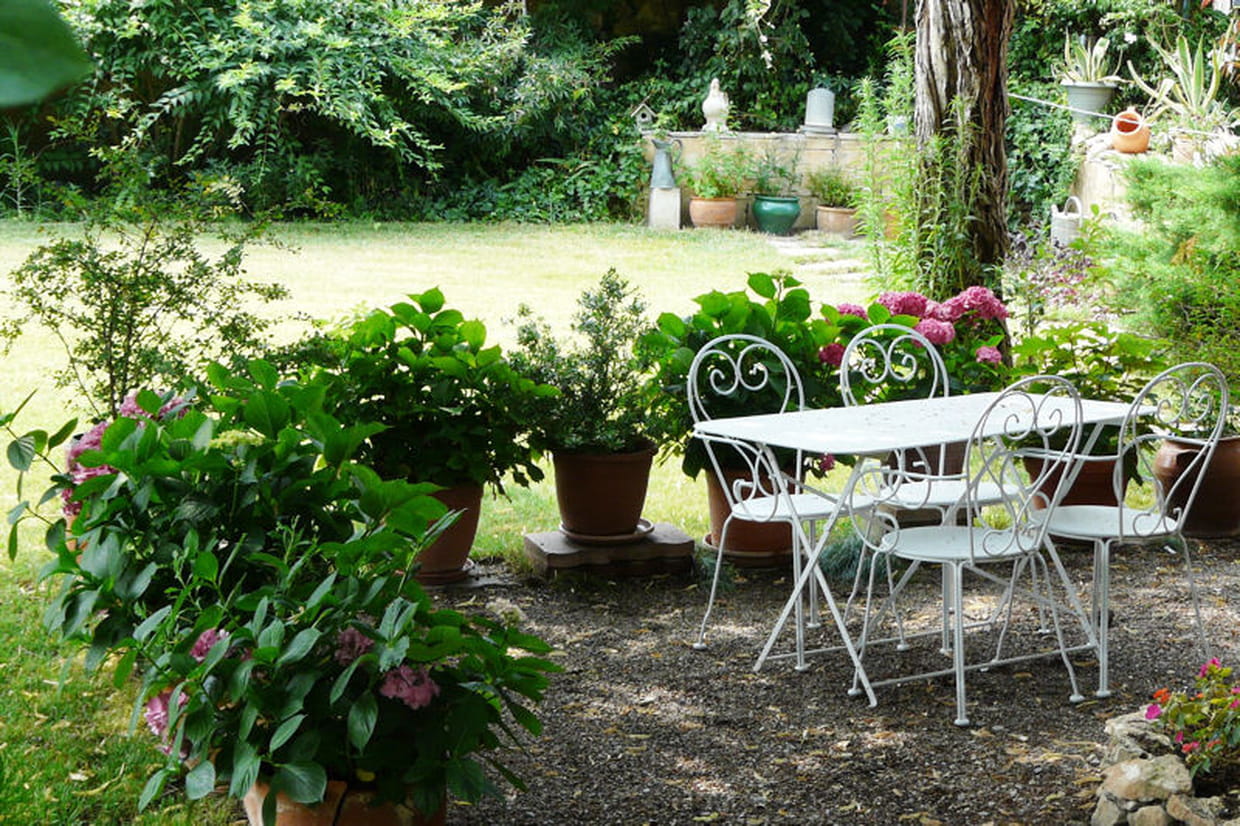 Avec ses fleurs qui embaument, sa pelouse bien coupée, ses nombreux feuillages et son mobilier de jardin en fer forgé, ce jardin romantique est parfait pour la détente.