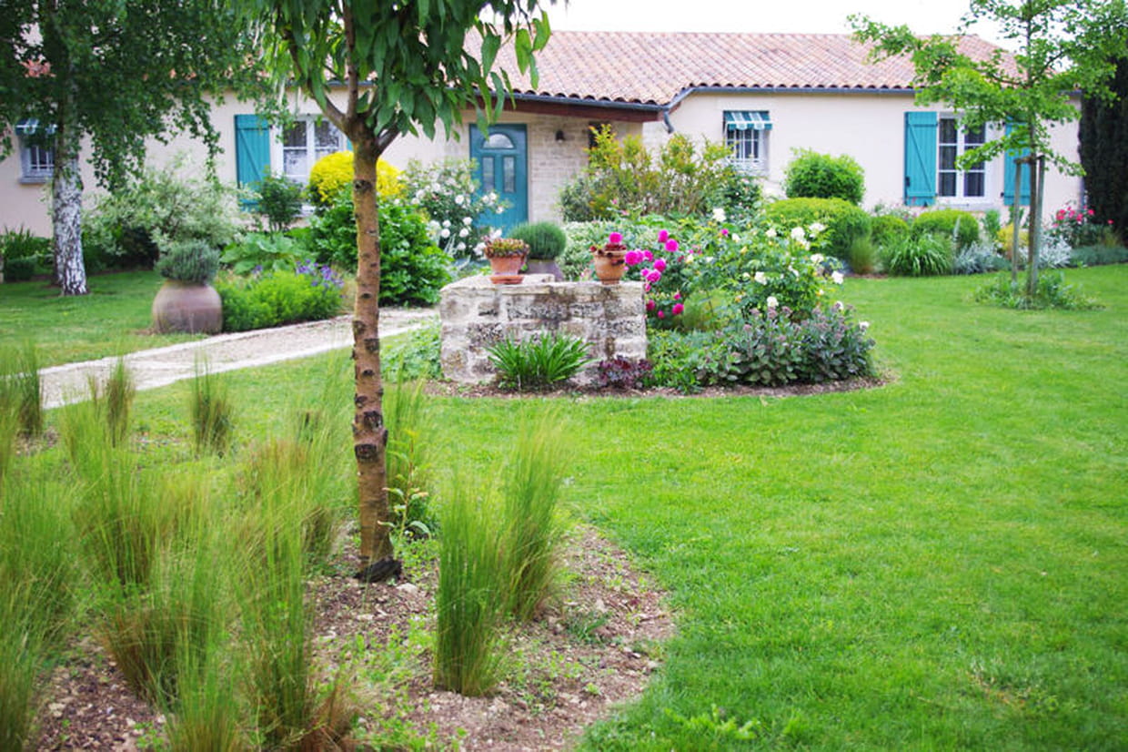 Brigitte a dessiné puis aménagé elle-même son jardin qui offre une profusion de fleurs jusqu'en juin suivie d'une profusion de fruits jusqu'en octobre !
