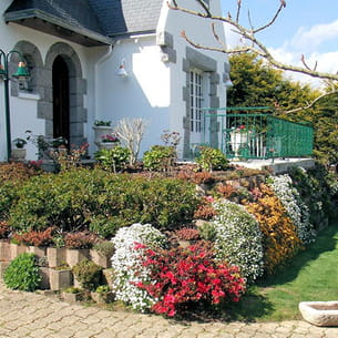 Dans ce jardin de 850 m², situé à la pointe ouest du Finistère, Monique-Hélène cultive avec passion et patience azalées, bruyères, rhododendrons, hortensias, agapanthes, camélias, vivaces et géraniums. Très fleuri, le jardin est aussi doté d'un coin de verdure où il fait bon se reposer. Typiquement breton avec ses grosses pierres et ses bancs en granit, ce jardin a obtenu le second prix des jardins fleuris de la ville de sa créatrice.