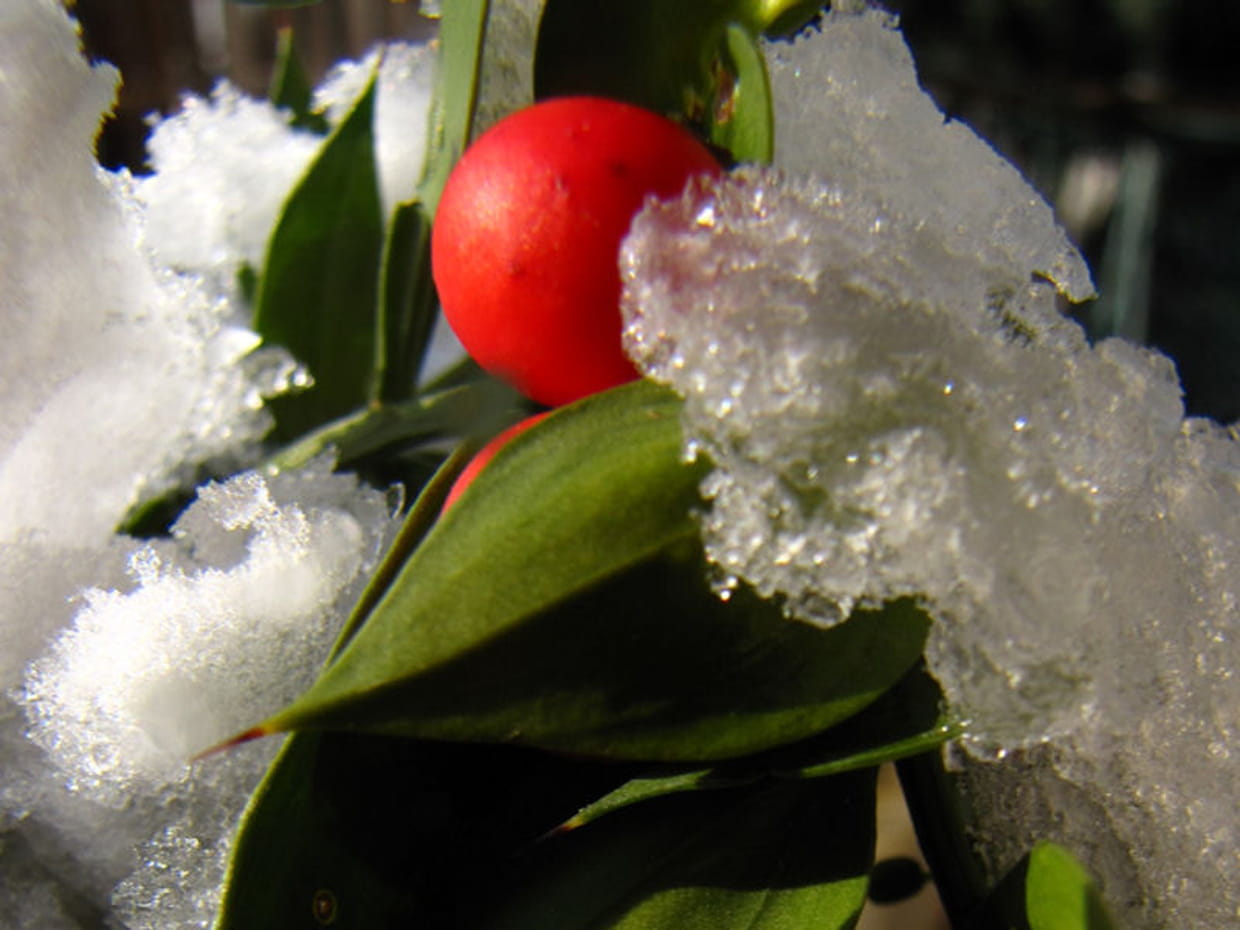 Vous pensez encore que l'hiver est une saison triste pour le jardin ? Les couleurs, lumières et formes étranges de ces images vont vous convaincre du contraire. Seules quelques feuilles et petites billes rouges de ce faux houx ressortent du manteau neigeux qui l'enveloppe.
