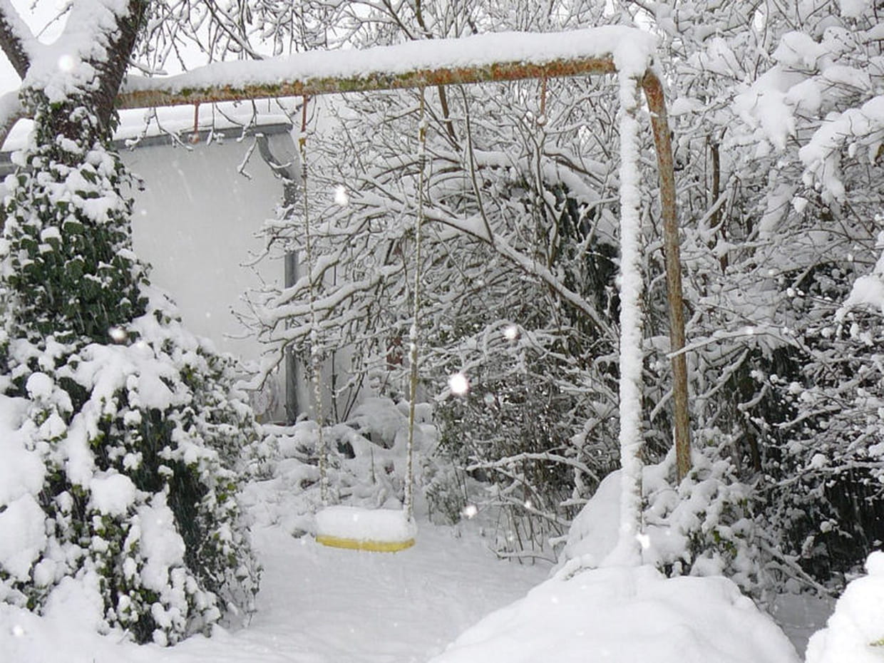 Il semble difficile d'imaginer des enfants s'amuser avec cette balançoire, alors qu'elle est recouverte par la neige qui ne cesse de tomber.