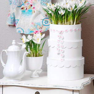 Un décor élégant et romantique avec les bulbes délicats de crocus. Plantés en groupes serrés, ces bulbes produisent un joli contraste entre le vert des tiges et le blanc et jaune des pétales.