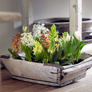 Une potée rustique et informelle réalisée dans un contenant en bois.