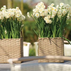 Des narcisses sur une table printanière installée dans le jardin, sur la terrasse ou le balcon.