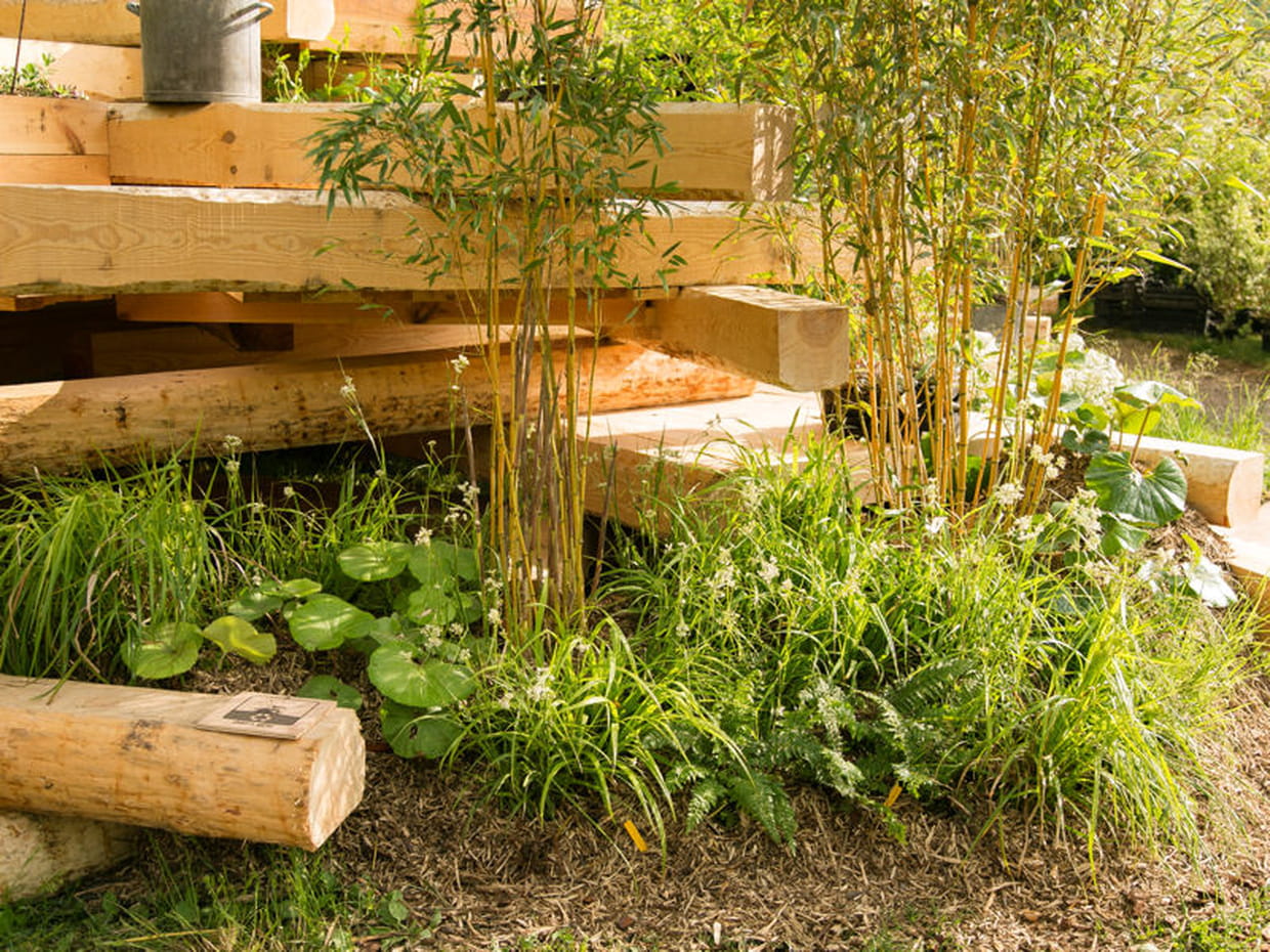 Partie du jardin en contact avec le sol, le jardin mère puise son énergie au plus profond de la terre. C'est dans cette forme de jardin que se fabrique l'humus et les substrats nécessaires à l'aménagement de jardins en hauteur. Voici les végétaux choisis pour ce type de jardin : le palmier nain (Chamaerops humilis), différentes variétés de fougères (Cyrtomium falcatum, Polystichum aculeatum, Polystichum setiferum), le bananier du Japon (Musa basjoo) et le lin de Nouvelle-Zélande (Phormium tenax).