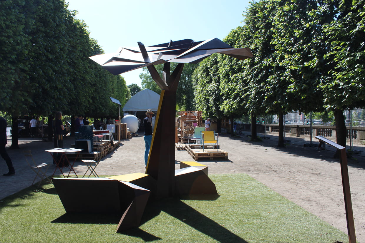 "L'Arbre Kiosque" a été réalisé en acier corten par l'artiste plasticien Guillaume Durost. Ce dernier souhaite proposer un espace de détente et de repos sculptural, évoquant la nature, afin de nous inviter à un moment de contemplation à l'ombre des rayons du soleil.