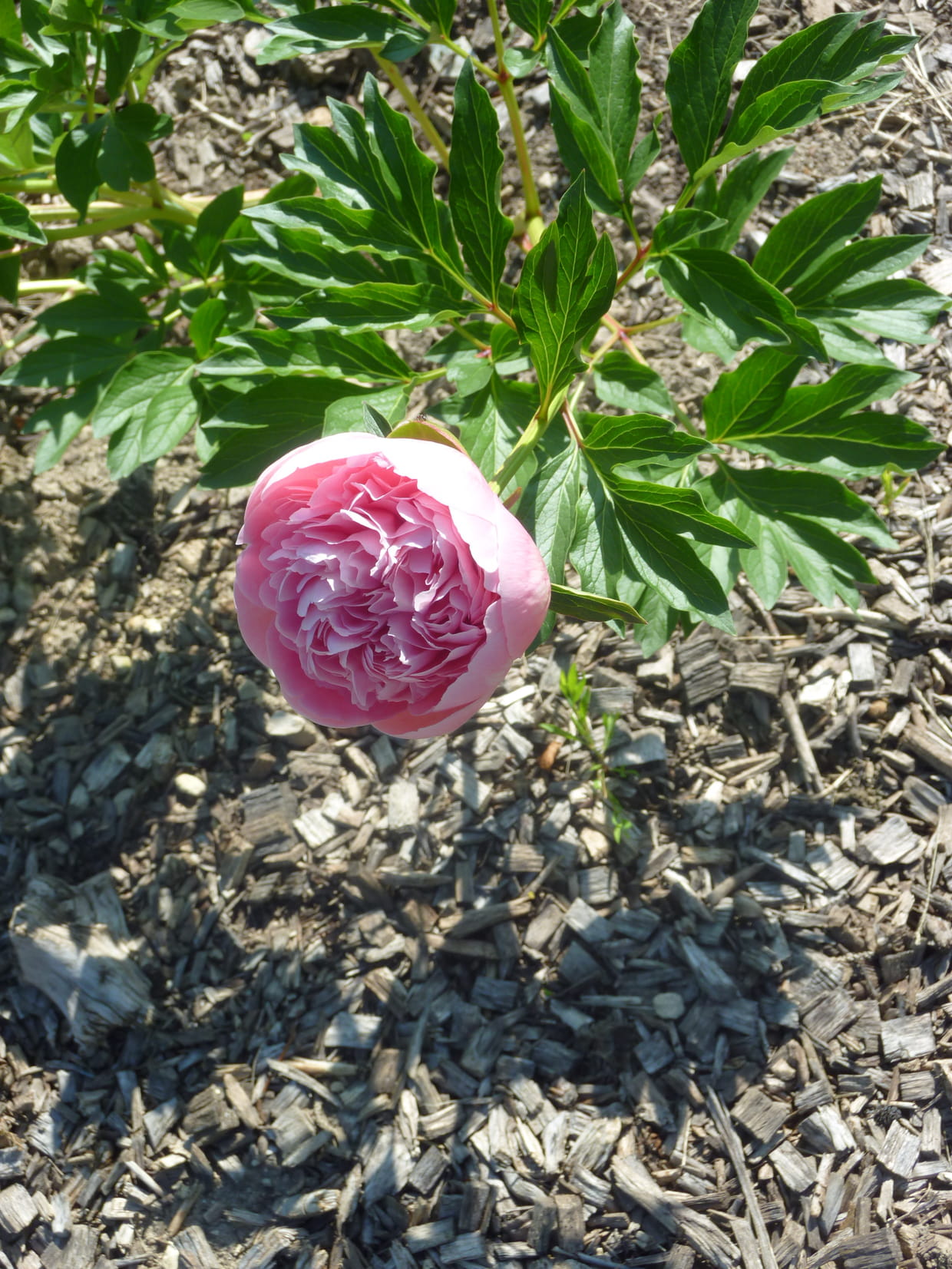 La terre est recouverte de copeaux de bois broyés. Ce paillage retient l'humidité et empêche l'herbe de pousser trop vite, ce qui facilite l'entretien du jardin.