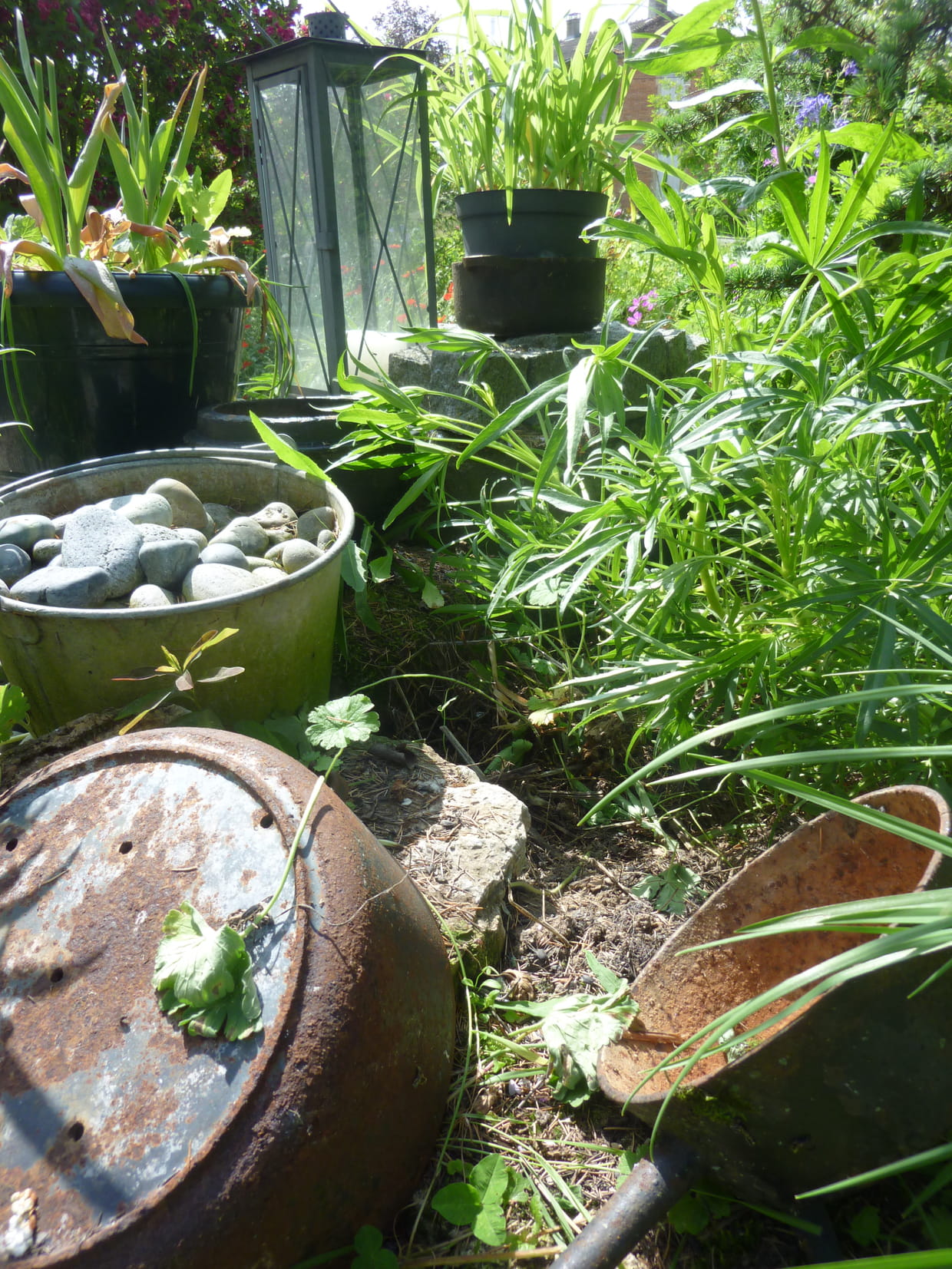 D'une façon générale, c'est Alain qui se charge de la déco du jardin. Par endroits, il a agencé quelques scénographies avec des accessoires, parfois du mobilier, récupérés à droite et à gauche.