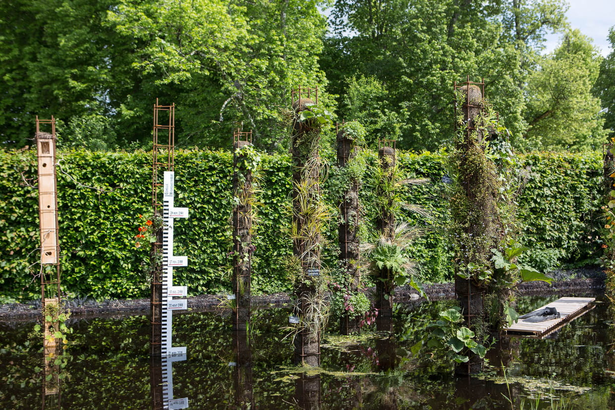 30 jardins présentant un panorama de la création paysagère dans le monde ont été sélectionnés pour cette 25e édition du Festival international des Jardins. Véritable observatoire et laboratoire sur le thème des jardins du futur (le thème du festival cette année), ces espaces invitent à la réflexion autant qu'à l'émerveillement. Ici, les concepteurs du jardin Néo-Néo ont présenté une installation passagère de parcs mytilicoles avec des tuteurs dépolluant l'eau pour nourrir les plantes grâce à un principe de phytoépuration, associé au système hydroponique.