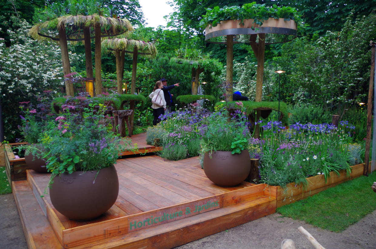 Début juin, le salon "Jardins, jardin" investit les Tuileries. Pendant quatre jours, on peut y admirer des créations de jardins exceptionnelles. Tour d'horizon de nos mises en scène végétales préférées. Pierre-Alexandre Risser et Solenn Moquet d'Horticulture & Jardins ont imaginé Paysan des villes, Cuisinier des champs, comme un jardin urbain. Planter, arroser, tailler, cuisiner, dresser la table, faire une sieste sous le figuier : cet espace vert nous invite au plaisir de vivre dehors et de savourer une cuisine de bouquets de fleurs.