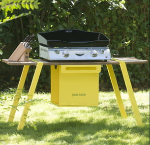 Les beaux jours sont arrivés et avec eux nos envies de grillades ! Pour les assouvir, à la ville comme en plein air, voici une sélection de barbecues et planchas. La plancha Innova, réalisée en acier émaillé, est inoxydable et imperméable. Elle repose sur son support Spia en acier jaune et bois exotique. Parfait pour la préparation des repas en extérieur.