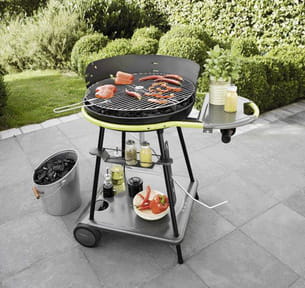 Sur son chariot, ce barbecue à charbon de bois rend la cuisine en extérieur pratique, puisque tout reste à portée de main.