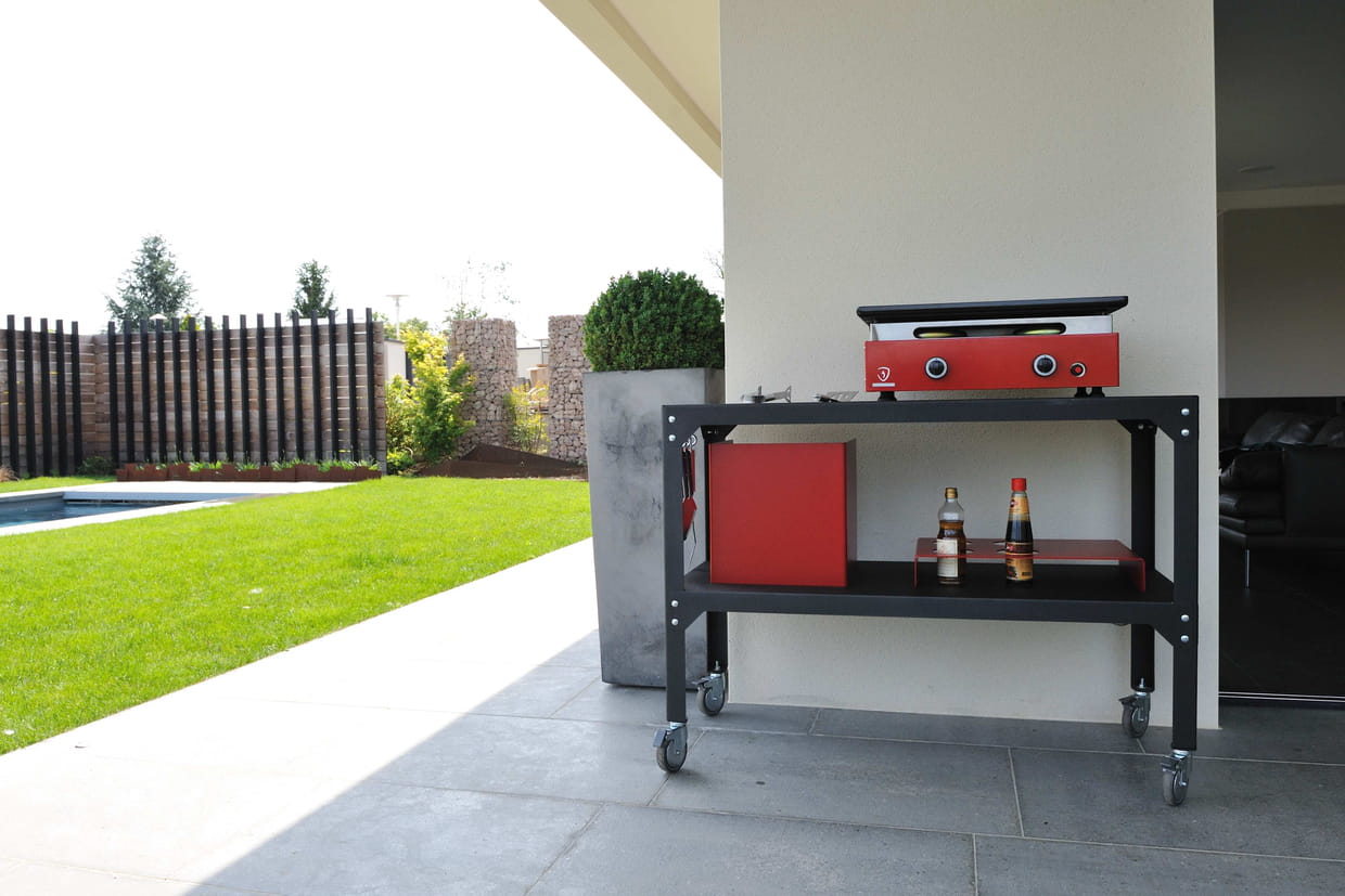 Plancha à gaz sur roulettes en acier galvanisé, par Matière Grise. Prix : 974 euros. Où l'acheter ? www.matieregrise-decoration.fr