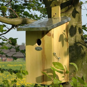 Ce nichoir en bois naturel à fixer à un arbre est prévu pour accueillir les mésanges bleues. Son petit plus : il est équipé d'une porte vitrée permettant à vos enfants d'observer les petits dans leur nid.