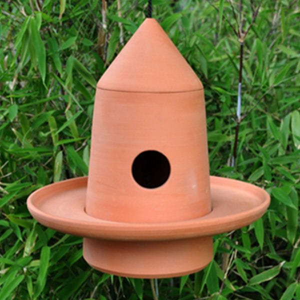 Fabriqué par la tuilerie Royer, ce nichoir en terre cuite à accrocher à un arbre permet d'accueillir tous les oiseaux qui peinent à trouver un abri en hiver. Sa forme originale nous a séduites.