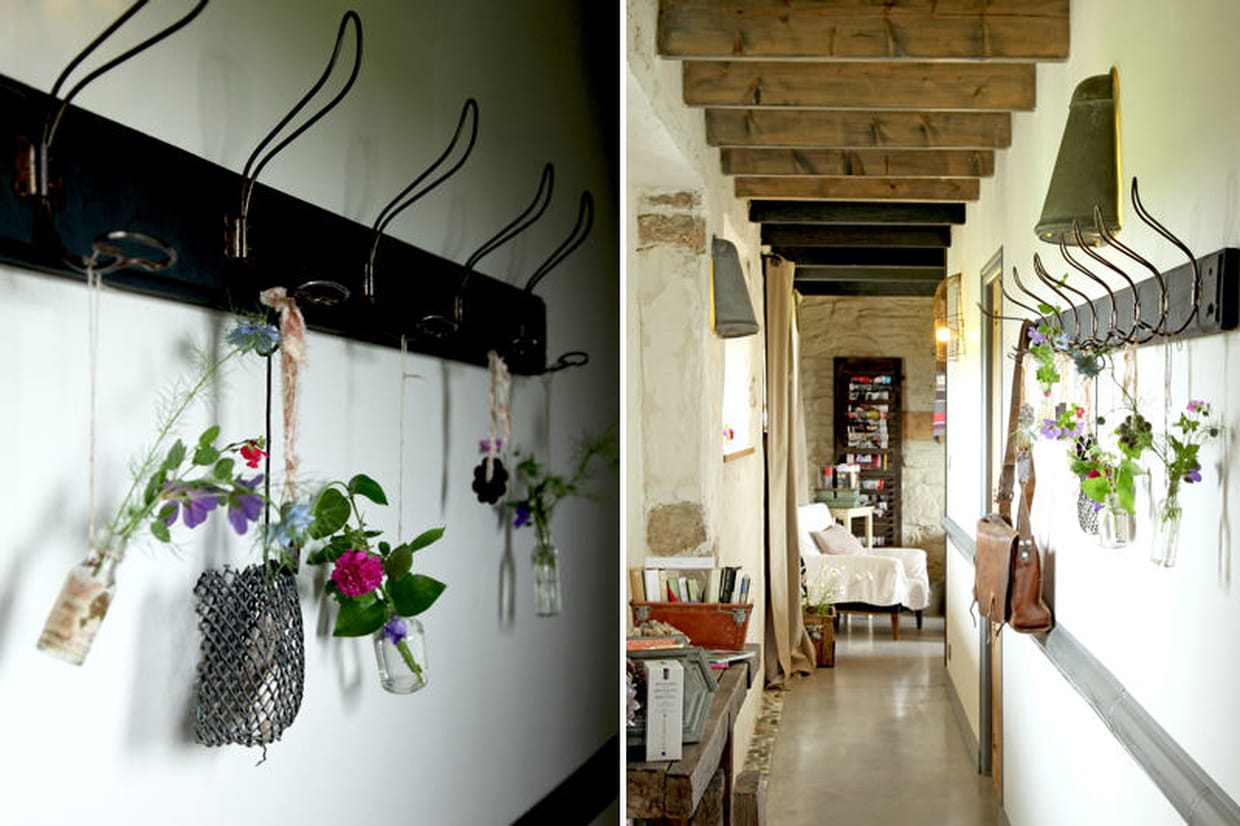 Suspendues au portemanteau à l'aide de corde, ficelle ou bout de tissu, et placées dans des petites fioles, ces fleurs sauvages composent un tableau enchanteur dans ce couloir. Voir le reportage