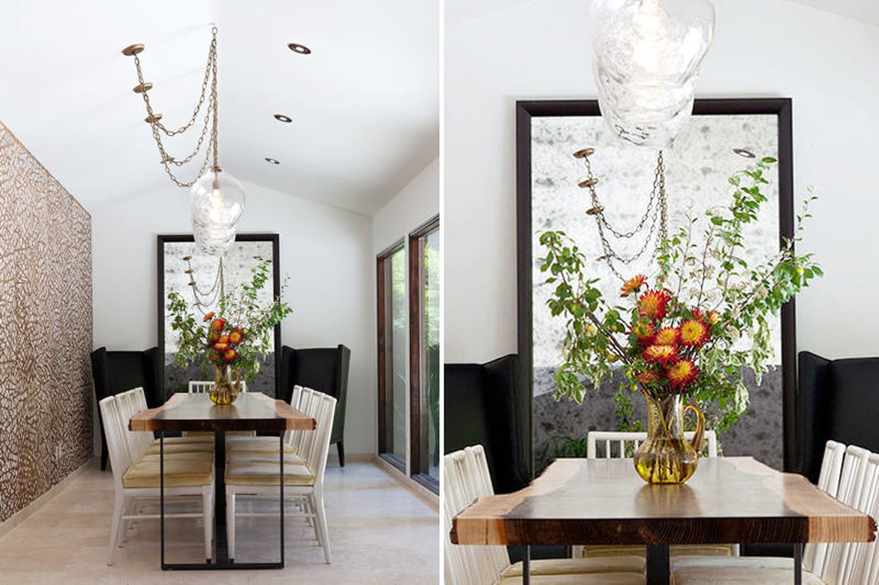 Sans ce magnifique bouquet et sa carafe assortie au jaune du cœur des fleurs, cette salle à manger ne serait pas aussi stylée ! Voir le reportage