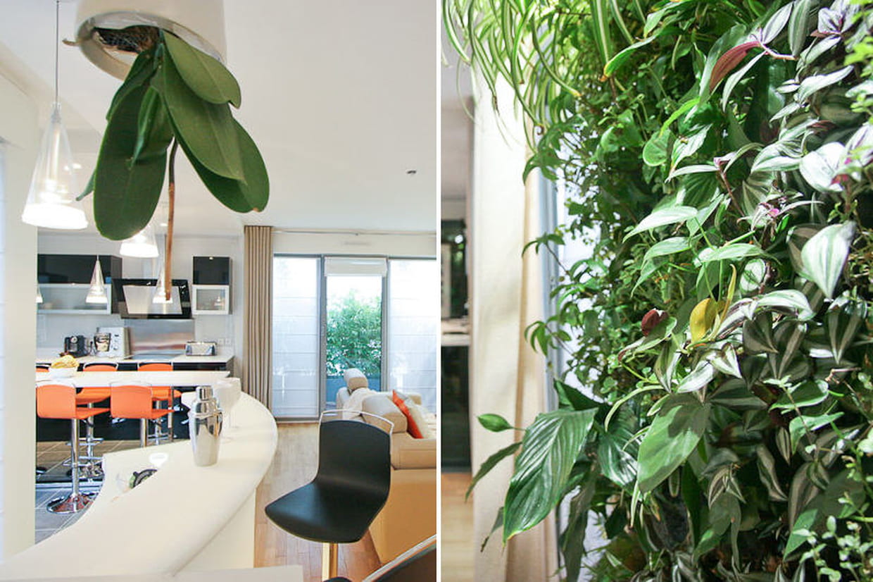 Les plantes ont, elles aussi, droit à leur part de créativité. La décoratrice d'intérieur Alexa Funes l'a bien compris. Dans cet appartement famililal, elle les a mis en scène de manière originale. En effet, à gauche, un pot d'orchidée est suspendu au plafond et renversé pour apporter une petite note décalée et fantaisiste dans un décor volontairement ordonné et épuré. A droite, un cadre végétal décore la pièce d'un rectangle vert qui répond à la petite terrasse située devant la cuisine. Cette intrusion de la nature dans l'appartement joue comme une fenêtre supplémentaire en diffusant une sensation de fraîcheur en plus d'avoir un effet relaxant. Voir le reportage