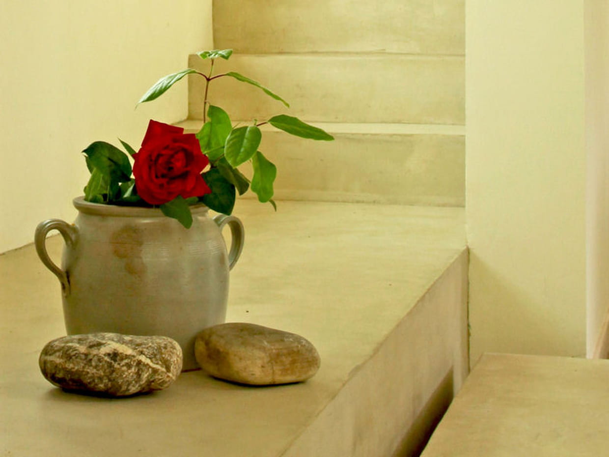 Cette rose rouge est mise en valeur par la jarre en grès dans laquelle elle repose. La nature reprend ses droits sur la déco grâce aux tons naturels et aux pierres disposées là comme si de rien n'était. Voir le reportage