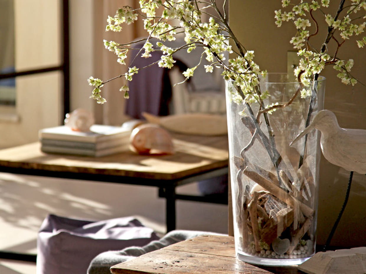 Les vases basiques peuvent également mettre en valeur branchages et plantes d'intérieur. A condition d'y apporter une touche d'originalité ! On y place par exemple quelques morceaux de bois flotté dans le fond, accompagnés de pierres lisses pour un effet bord de mer garanti. Voir le reportage