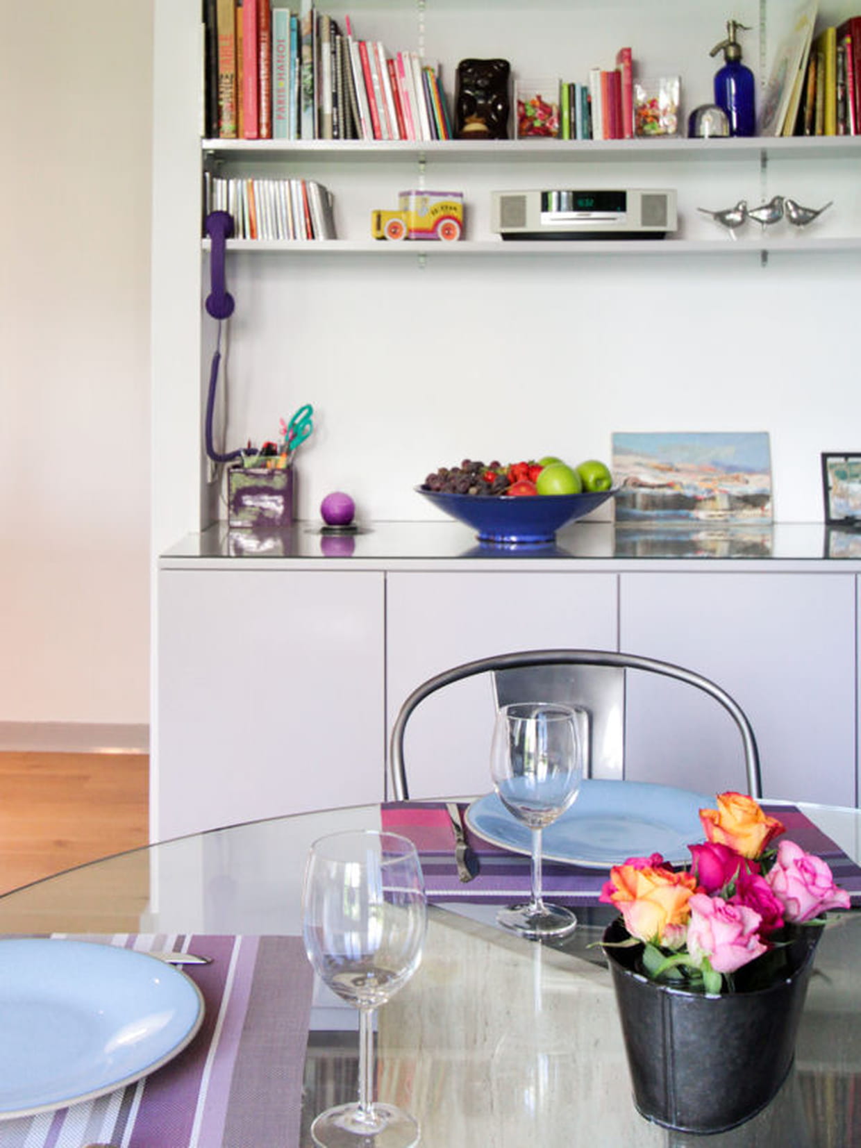 Sur cette table en verre, Laurence Garrisson a disposé un petit sceau métallique comme présentoir à roses. Cet accessoire s'accorde parfaitement avec les chaises en inox Tolix. Voir le reportage.