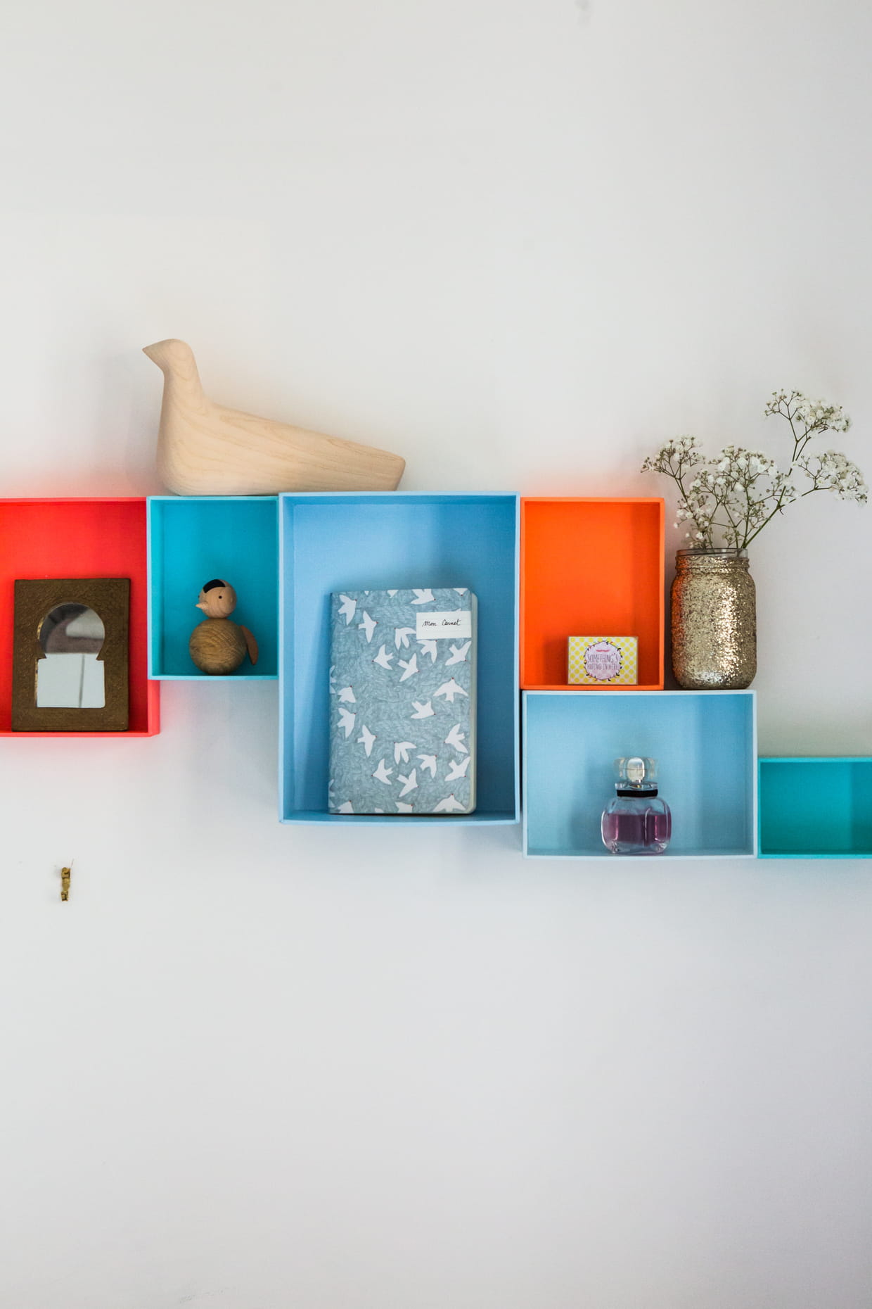 Cet assemblage de petites boites colorées permet de nombreuses excentricités. Entre un miroir, un flacon de parfum et un carnet, un petit pot, entièrement recouvert de paillettes, accueille quelques tiges de gypsophile. Voir le reportage