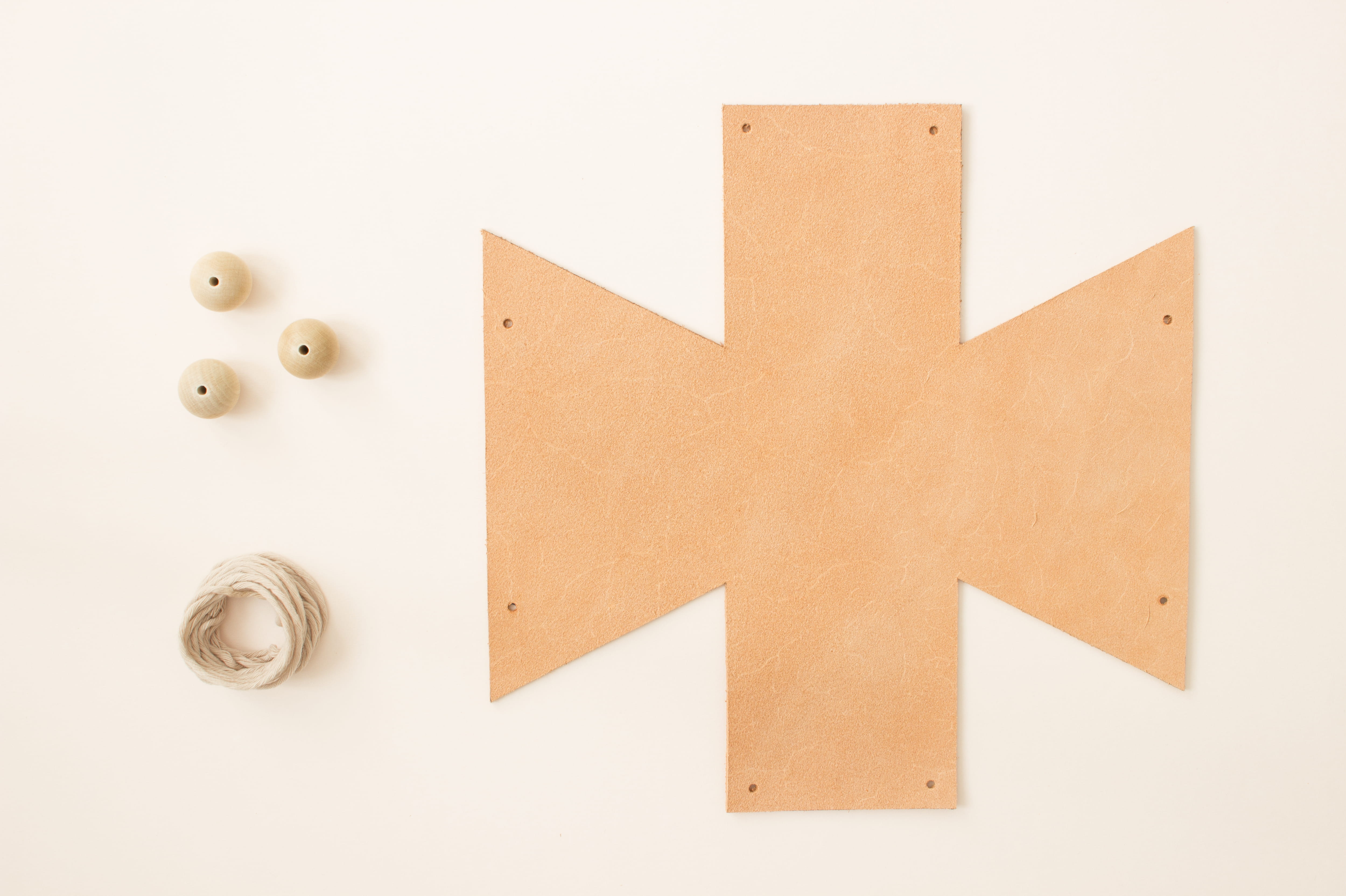 • 1 patron en cuir (dans un carré de 50 cm x 50 cm, faire découper par un cordonnier un patron en forme de croix avec deux extrémités élargies)