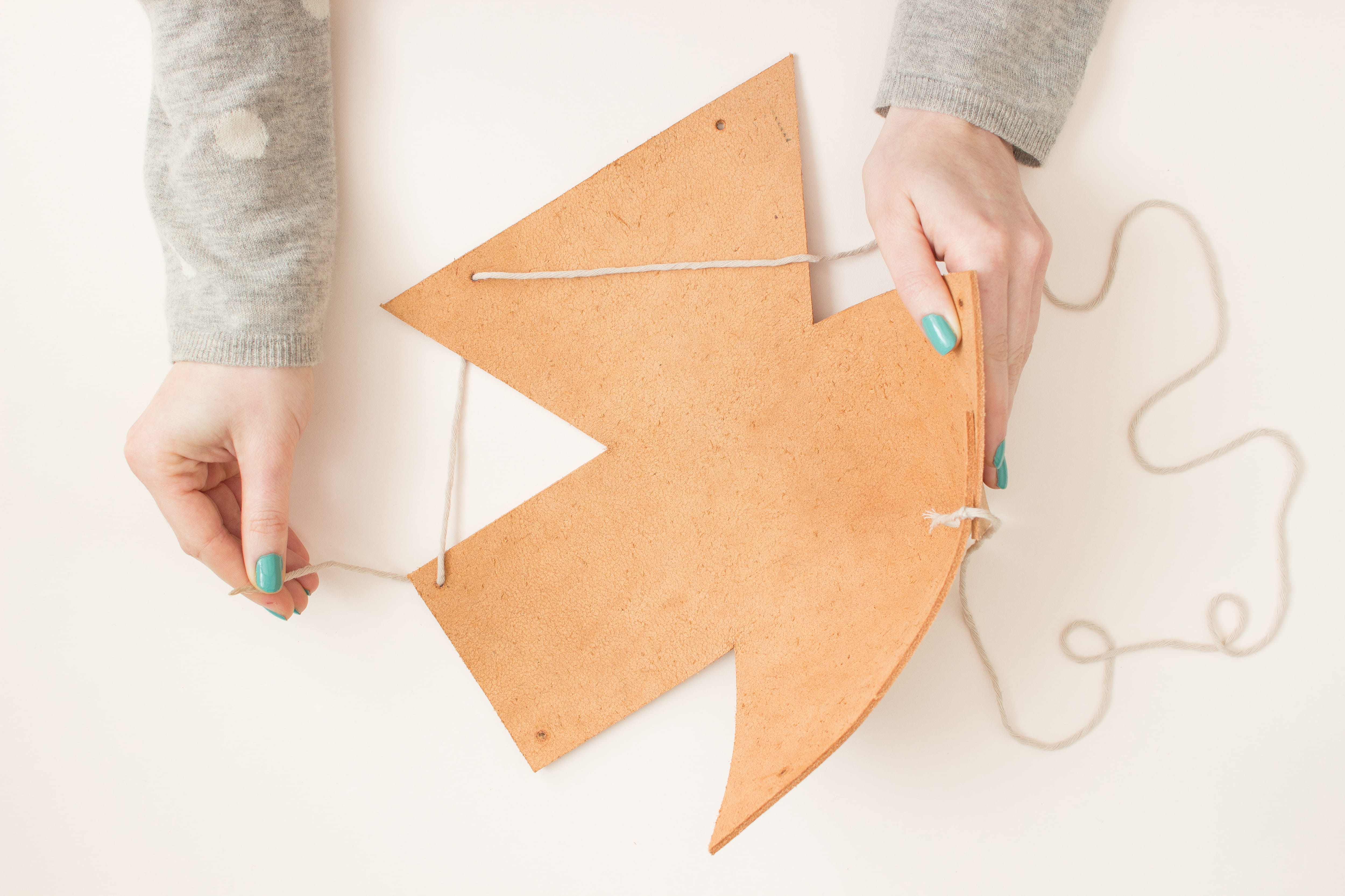 Faire passer la première ficelle dans deux trous se faisant face, comme indiqué sur la photo. Rabattre la languette sur le carré de cuir de manière à superposer les deux trous. Faire un nœud plat en serrant bien et en laissant peu de ficelle dépassée. Si nécessaire, couper le petit bout de ficelle restant.