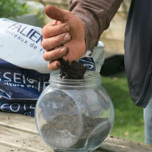 Tapisser le fond du bocal d'une couche de terreau. Remplir environ 1/4 du bocal et surtout pas plus d'1/3.