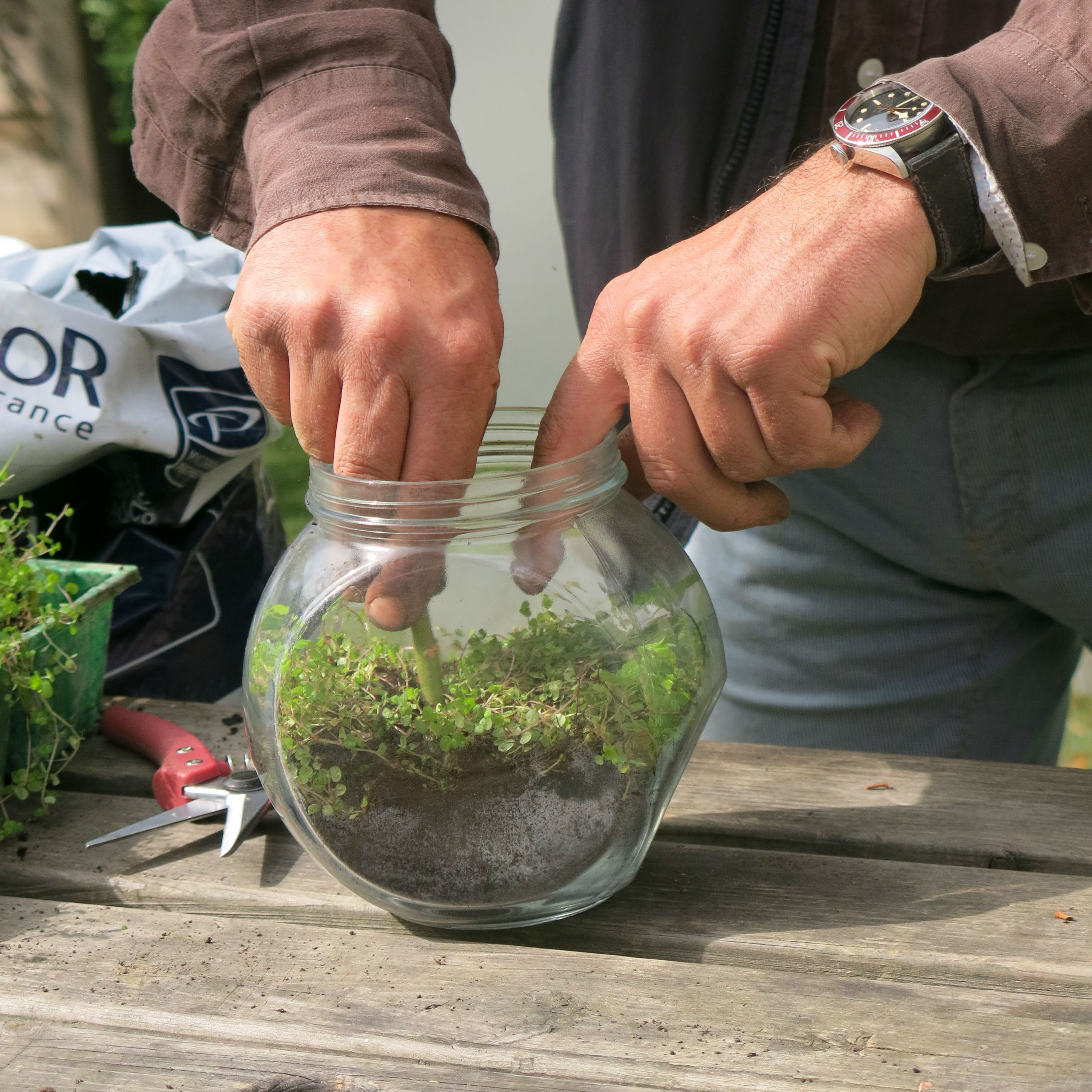 Recouvrir la terre d'un tapis de mousse. La tasser, juste assez pour qu’elle adhère bien. La mousse Helxine a ici été utilisée. Elle est résistante et esthétique. C'est une bonne base de protection pour vos boutures, qui garde l’humidité et réduit ainsi le nombre d’arrosages nécessaires. Par ailleurs, sa couleur indiquera son besoin ou non en eau : si elle est verte tout va bien. Si elle devient jeaunâtre, elle a soif !