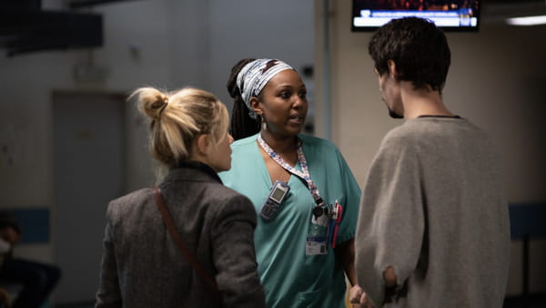 Catherine Corsini : On avait des tests toutes les semaines, un représentant Covid qui nous changeait les masques, des règles de distanciation... On était dans un moment de contraintes. Il y a des endroits où l'on n'a pas pu tourner, comme les couloirs de l'hôpital Lariboisière à Paris, qui étaient très importants pour moi parce qu'immenses à s'y perdre, avec des endroits magnifiques. On s'est retrouvés à tout faire dans un lieu qui ne correspondait pas à ce que j'imaginais, mais malgré tout ça, on avait cette chance de pouvoir tourner. Dès qu'on recevait nos résultats et qu'on savait qu'on n'avait pas de cas de Covid, on était tellement heureux, fiers de faire très attention. Ça a créé une espèce de solidarité. Les soignants n'étaient pas à notre disposition, ils avaient posé leurs jours pour venir tourner et le reste du temps, ils étaient réquisitionnés pour la pandémie. Il fallait faire très attention à ça. On était respectueux de ce qu'ils pouvaient dire et eux étaient très contents d'être représentés dans un film. Ce n'était pas rien qu'ils soient avec nous, ça nous donnait une légitimité incroyable pour faire le film.