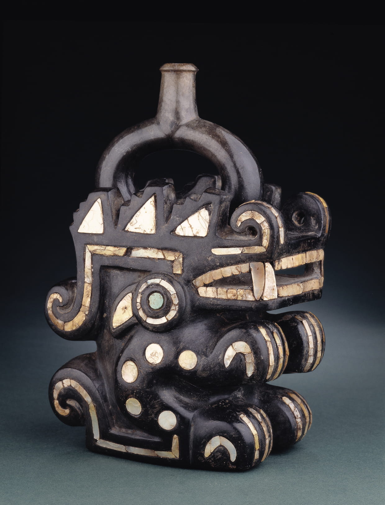 Cette bouteille à anse étrier en céramique issue de la culture mochica (100 - 800 apr. J.-C.) représente un être zoomorphe hybride, connu sous le nom de félin rampant, animal lunaire, chien ou renard lunaire, ou encore dragon andin. Cette créature est fréquemment représentée dans l'art précolombien du nord du Pérou, à la fois sur la côte et sur les hautes terres andines ; elle est associée à des êtres nocturnes, tels que le hibou et la lune. Seul un personnage important de la mythologie andine pouvait être fréquemment représenté avec autant de maîtrise artistique et des matériaux aussi précieux que la nacre, le coquillage de Strombus et la turquoise verte.