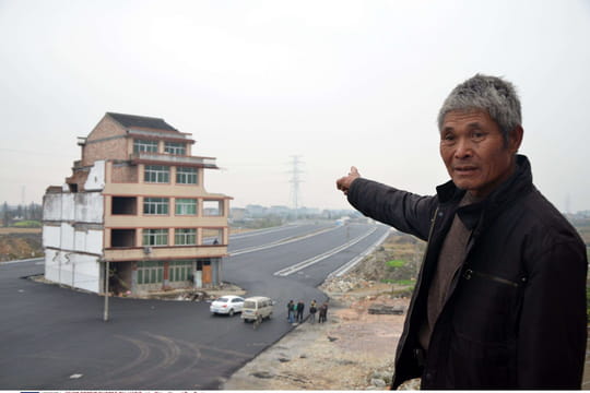 Dans la ville de Canton, une propriétaire d'une maison gênant le parcours d'une nouvelle route s'est vue offrir l'équivalent de 186 000 dollars et une nouvelle maison proche d'une morgue, mais elle réclamait 287 000 dollars pour quitter le logement selon Le Figaro. La propriétaire n'a pas cédé et comme la loi chinoise protège la propriété privée, l'autoroute a été construite autour de la maison ! "Vous pensez que c'est un environnement misérable, mais pour moi c'est calme, libérateur, plaisant et confortable", a-t-elle expliqué au Daily Mail.