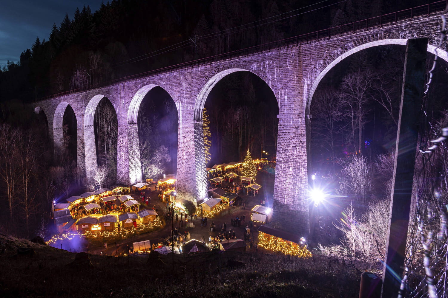Vous découvrirez un pont de pierre monumental, sur lequel passe le train, qui surplombe les chalets du marché de Noël dans une ambiance conviviale et avec une musique traditionnelle qui résonne sous le viaduc. Les artisans y proposent des créations locales, telles que des décorations en bois, mais aussi des spécialités régionales.