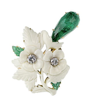 Dans la forêt enchantée du joaillier créateur Alexandre J, les fleurs en ivoire sculpté sont montées sur or jaune et parsemées d'émeraudes et de diamants. Un ravissement !