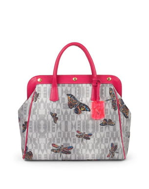 On adore le mélange des genres de ce sac Furla, idéal pour l'été. Sa forme diligence très rétro s'impose en contraste avec le coloris rose flashy et l'imprimé papillons et libellules. L'association de toile et de cuir veau fonctionne également à merveille. Un modèle à afficher toute la belle saison !