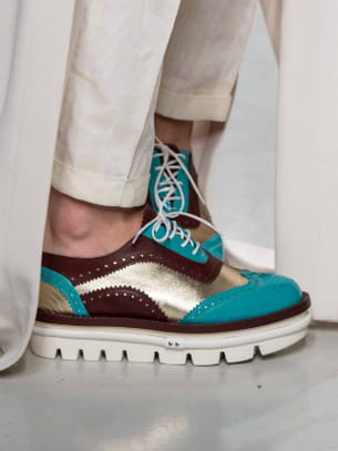 Julien Fournié, le créateur haute couture qui a défilé le 27 janvier pour sa collection PE 2015, a sorti pour l'occasion une nouvelle paire de derbies en collaboration avec le FashionLab. On a pu les voir portées sur le catwalk, que ce soit avec un pantalon de smoking, une jupe longue fluide, et même une robe droite longueur genou. Les derbies "Bumper" Julien Fournié x FashionLab accessoirisent des styles très variés et sortent n'importe quelle tenue de l'ennui grâce à leur originalité et leur élégance décalée. Avec leur semelle rehaussée blanche, elle ont un petit air de creepers très tendance. Quant au choix des couleurs associées aux épaisses semelles et fins lacets blancs, on trouve un combo de 3 cuirs qui jouent sur les contrastes de tons et de textures. Henné mat, doré lamé et turquoise verni : l'alliance chromatique gagnante de 2015.