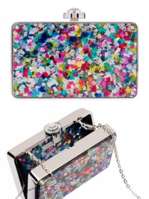 Véritable rencontre du bijou et de la pochette, ce clutch multicolore à sequins a conquis nos cœurs. Rigide, rectangulaire et métallisé, l'objet griffé Miu Miu pourrait paraître strict. Pourtant, ses angles arrondis et ses paillettes carrées façon confettis lui confèrent un esprit très festif. Le détail du bouton d'ouverture transparent rappelle le plexiglas qui recouvre les faces principales : tout est dans le détail. Rusée, la chaîne bandoulière est bien là pour plus de praticité, même si elle peut aussi se cacher au sein du sac . Comble du luxe, le satin double l'intérieur de ce clutch, authentique crush de la rédaction.