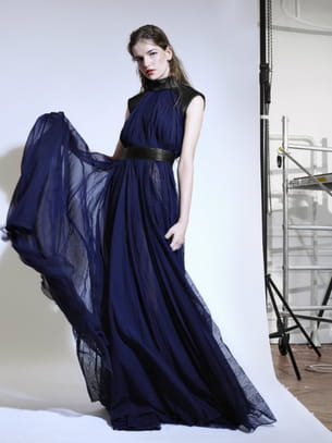 Les grands soirs méritent leur grande tenue. C'est en tout cas la philosophie en vigueur au Liban, où Karine Twill a créé sa maison Karoline Lang, avant de poser ses valises au 45 avenue Montaigne. Ce sens du chic grandiose se propage entre les milliers de plis qui décorent notre coup de cœur, sa robe longue bleu nuit, issue de sa première collection soir. Modernité et savoir-faire caractérisent cette pièce qui alterne savamment mousseline de soie, dentelle et cuir plissé main, une technique développée par ses soins dans ses ateliers de Beyrouth. Soulignant épaules et taille, la rigidité du cuir sculpte une carrure élégante et entre en conversation avec les voiles féminins. Une belle façon d'épouser la nuit.