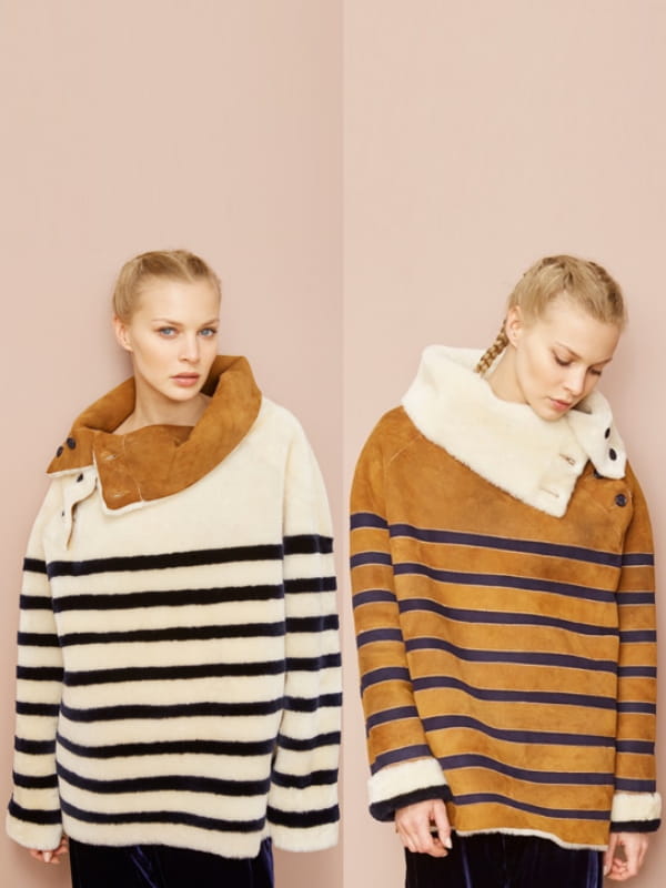 Un pull qui fait aussi manteau tant il est chaud : un concept qui nous séduit, surtout quand on voit le produit ! Mes Demoiselles, la marque gypset parisienne, nous a totalement fait fondre avec son manteau qui s'enfile et qui tient nos corps frileux bien à l'abri des basses tempérétures grâce à sa forme très ample (qui permet d'y glisser un autre pull dessous), son grand col montant et sa matière 100% anti-froid. En effet, le manteau "Arctique" est entièrement en mouton, retourné ou pas puisqu'il a le génie d'être réversible. Un côté en laine blanche et rayures noires avec le col boutonné en peau naturelle, et un côté en peau à rayures bleu marine avec son col tout doux en laine blanche. Chaleur, originalité, élégance et praticité : ce vêtement d'extérieur a tout pour nous subjuguer !