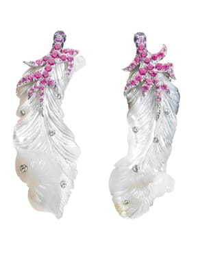 Victoire de Castellane pare les belles de légèreté avec ces boucles d'oreilles en forme de plumes. Mais quel est cet oiseau rare dont le plumage est fait d'or blanc, de diamants, de saphirs violets et de nacre ?