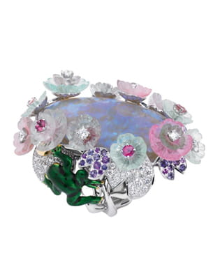 Une grenouille se cache dans les fleurs précieuses entourant un étang d'opale noire... Avec son univers à la fois ludique et merveilleux, Victoire de Castellane crée le ravissement.