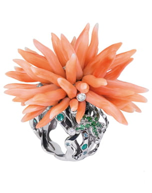 Forêt enchantée, lac magique, oiseau de rêve, toute la nature inspire la créatrice... Les profondeurs de l'océan aussi. Sur cette monture-rocher en or blanc, où s'accroche une étoile de mer, se déploie une majestueuse anémone en corail.