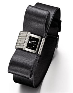 Avec ce joli nœud en satin en guise de bracelet et cette boîte en or blanc pavée de diamants, il n'y a rien d'étonnant à ce que cette ravissante montre appartienne à la ligne Couture de Piaget. Quand un garde-temps se fait aussi bijou, on aime forcément !
