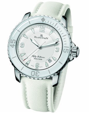 La maison Blancpain vient de dévoiler cette toute nouvelle "Fifty Fathoms Automatique" dont les blancs atours sont empreints d'une élégance et d'une sobriété chères à la marque. Elle est équipée d'un fond saphir qui laisse admirer toute la beauté et la complexité de son mouvement composé de 222 pièces, sans compromettre son étanchéité à 300 mètres. La "Fifty Fathoms" n'a pas fini de révéler ses atouts, puisque dans les prochaines saisons, elle se parera de nouvelles teintes et de luxueuses finitions, pour le plus grand bonheur des passionnées de belle mécanique.