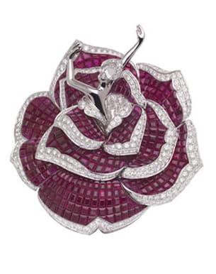 Ballerines, petits rats, danseuses espagnoles... Ce thème a toujours inspiré la maison joaillière. A la faveur d'une rencontre en 1967 avec le chorégraphe George Balanchine, elle a accompagné la création du ballet "Jewels" dédié à trois pierres précieuses : l'émeraude avec Fauré, le rubis avec Stravinski et le diamant avec Tchaïkovski. En 2008, Van Cleef and Arpels crée une toute nouvelle collection intitulée "Ballet précieux", dont ce clip Gloria en platine et or rouge sertis de diamants et rubis fait partie.