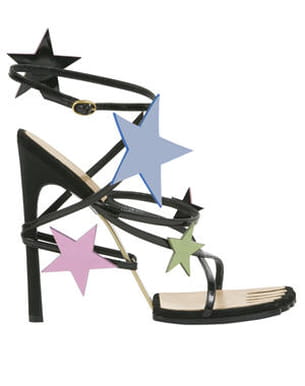 Pluie d'étoiles sur la collection printemps-été 2008 d'Yves Saint Laurent. C'est encore une fois la grande maison qui a lancé un des motifs phares de la saison. On le retrouve notamment sur cette paire de sandales fraîche et décalée. Ce modèle "star" de l'été en cuir verni noir séduira plus d'une modeuse, avec ses ornements métalliques version multicolore en Plexiglas qui brilleront sur vos pieds. Même si pour nous, l'unique étoile qui ne cessera jamais de scintiller, c'est celle d'un grand homme, Yves Saint Laurent...